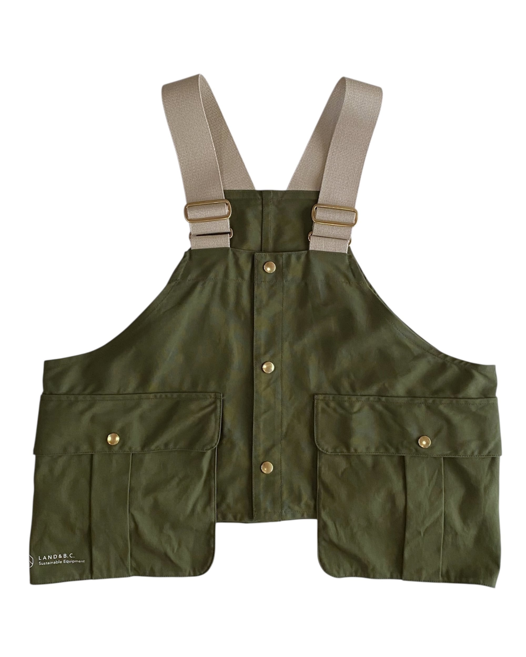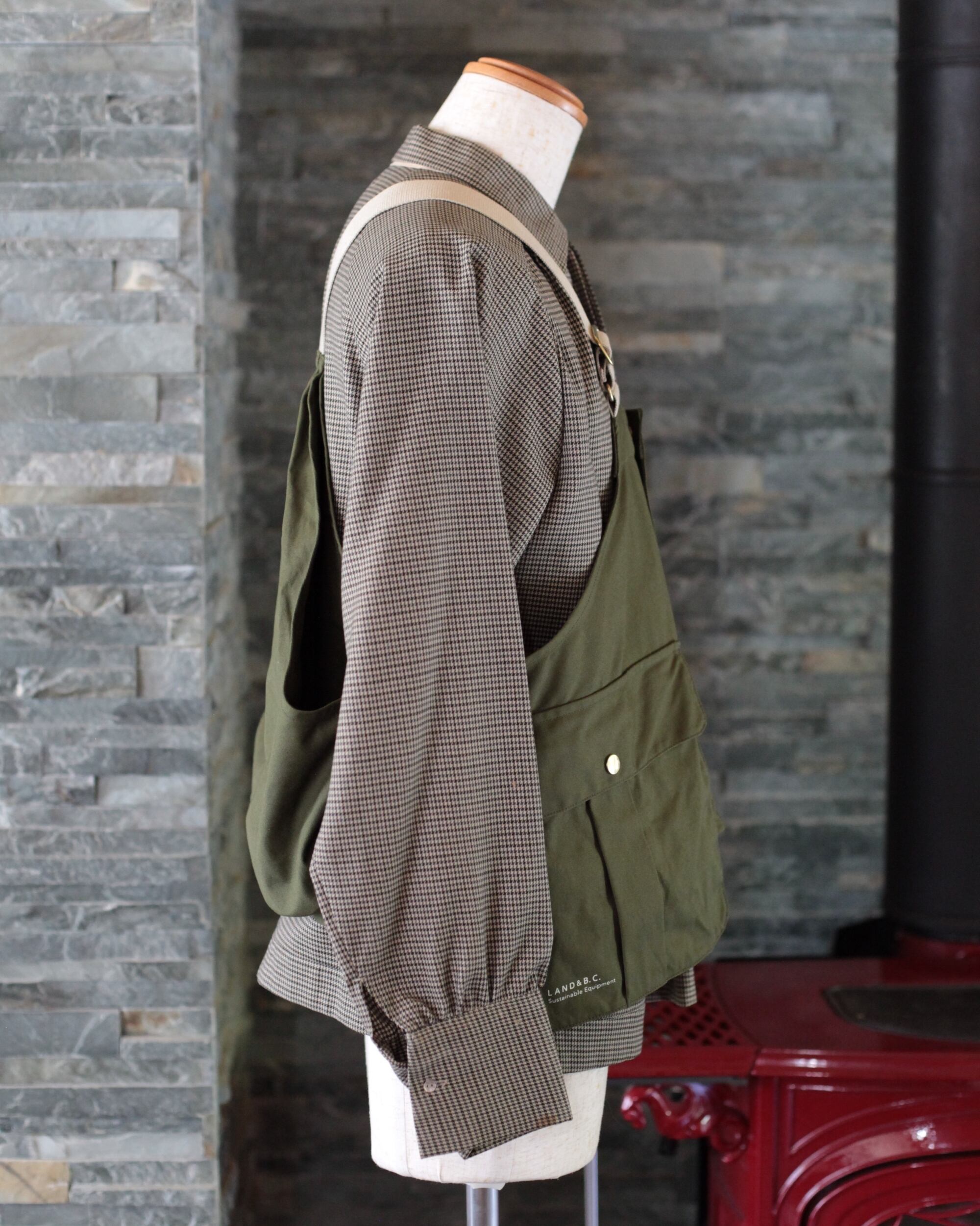 前面からサイドに渡るフラップ付きポケットと背面の大きなゲームポケットが特徴の、絶妙なバランスのショート丈ベスト。フラップ付きポケットは、フラシポケット(上部のみ本体に縫い付けて浮いた状態)になっています。