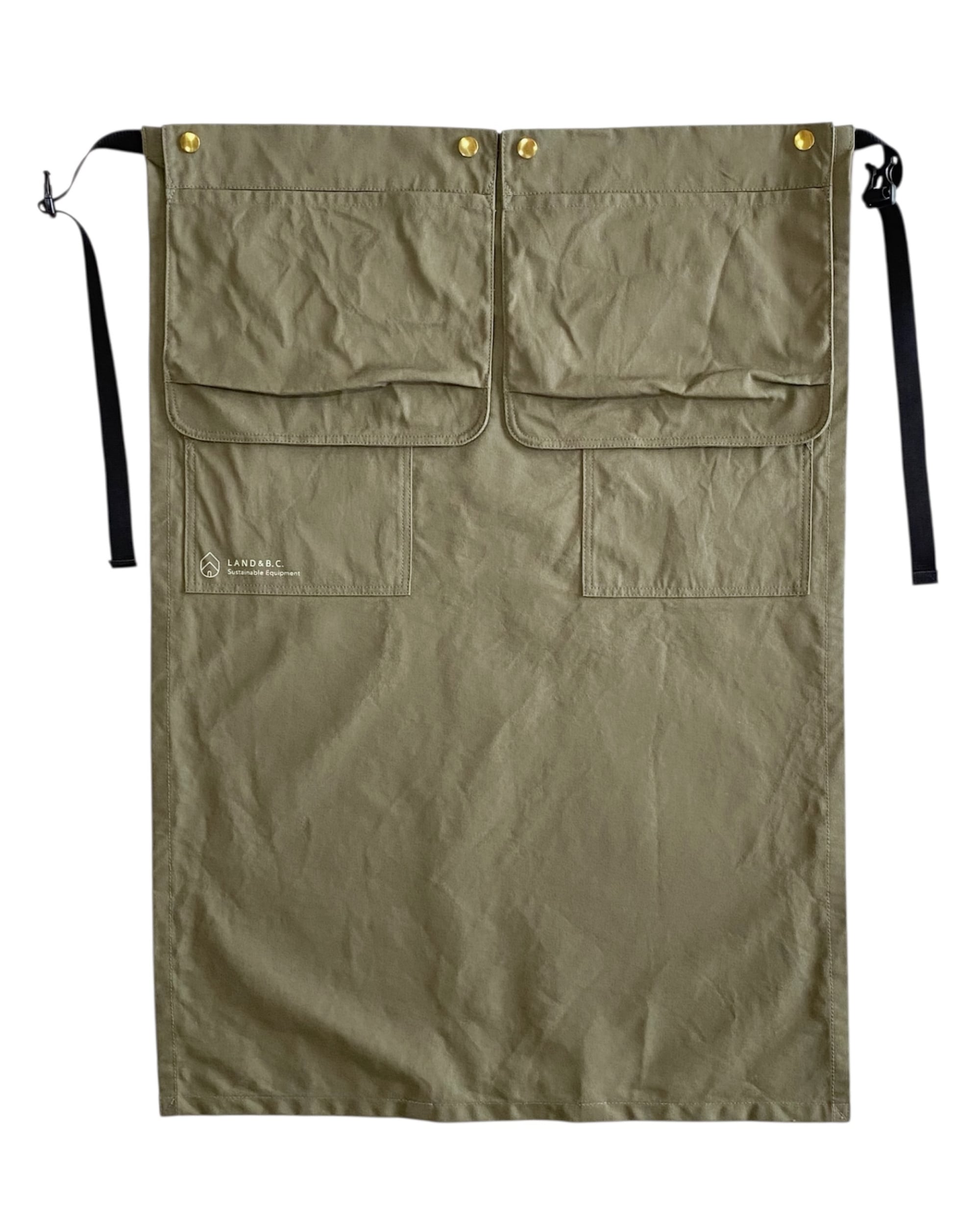 アウトドア(屋外)での使用を想定しており、前掛けエプロンとして単体での使用はもちろん、ハントベストにセットアップしてポケットにコーススレッドなどを入れてDIYに勤しんだり、愛犬との散歩時にトリーツを忍ばせたり、他にもガーデニングやキャンプなど様々なシーンで活躍します。
